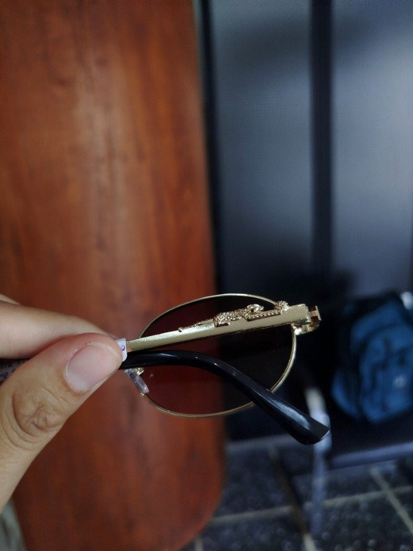 Anteojos de armazón metálico dorado y cristales marrones, sin graduación. En las patillas tienen un detalle de gatito y bisagras de metal.