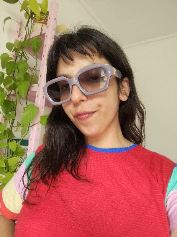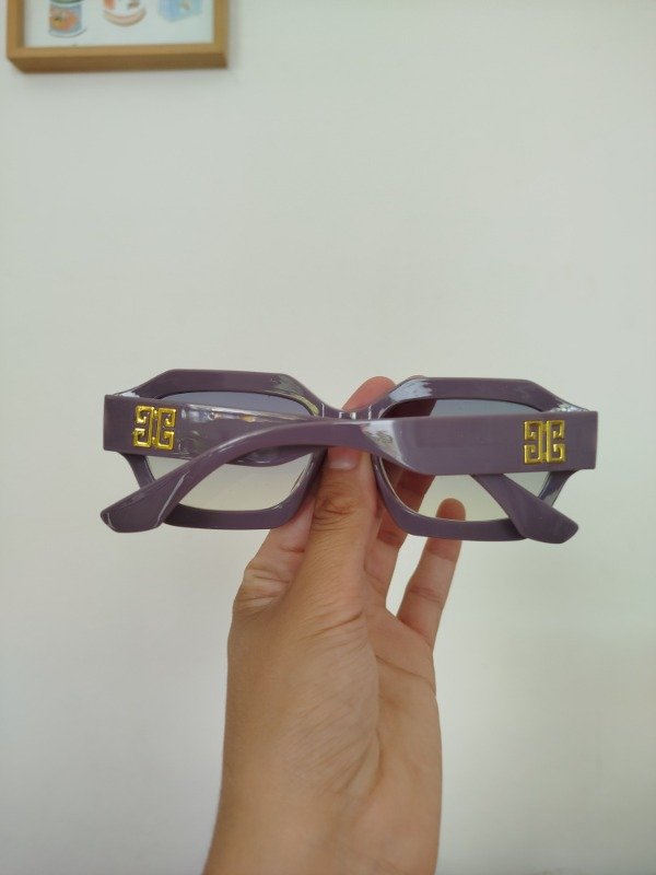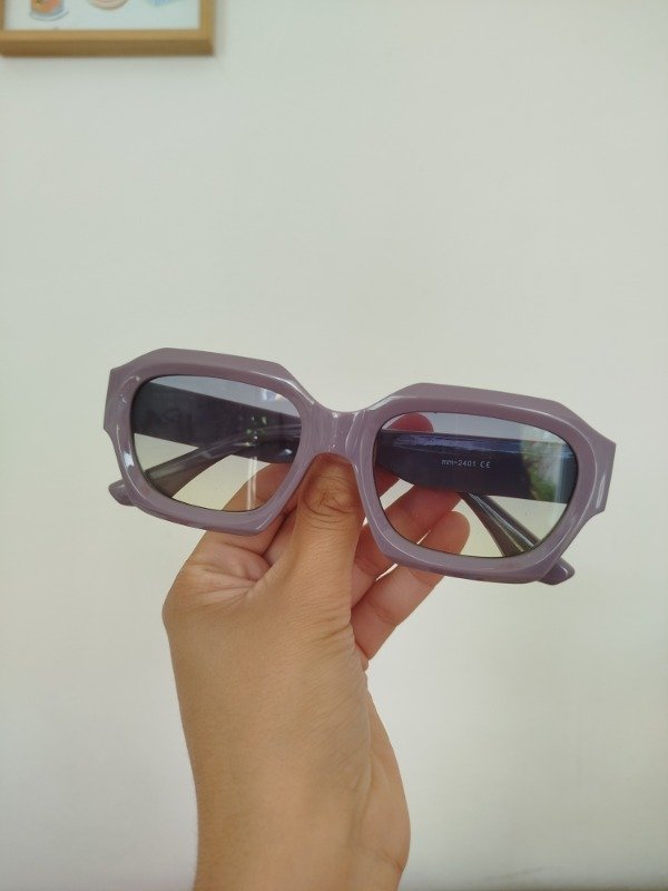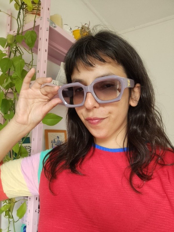 Anteojos de armazón de acetato lila y cristales negros degrade. Detalle decorativo en las patillas.