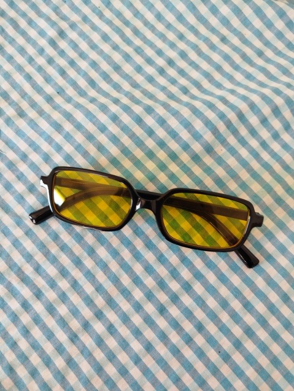 Anteojos de armazón de acetato negro y cristales amarillos. Detalle decorativo en las patillas.