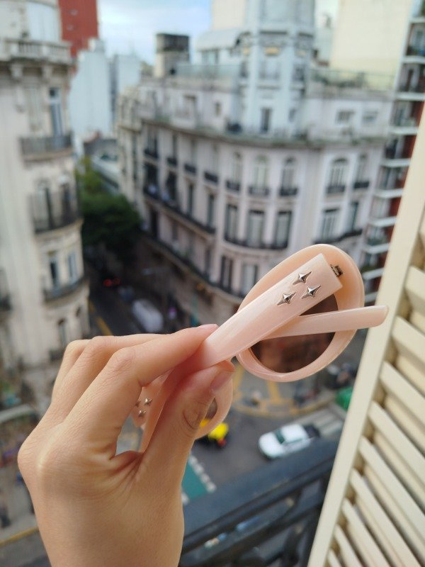 Anteojos de armazón de acetato rosa y cristales marrones sin graduacion, bisagras de metal. Estrellitas decorativas en las patillas .