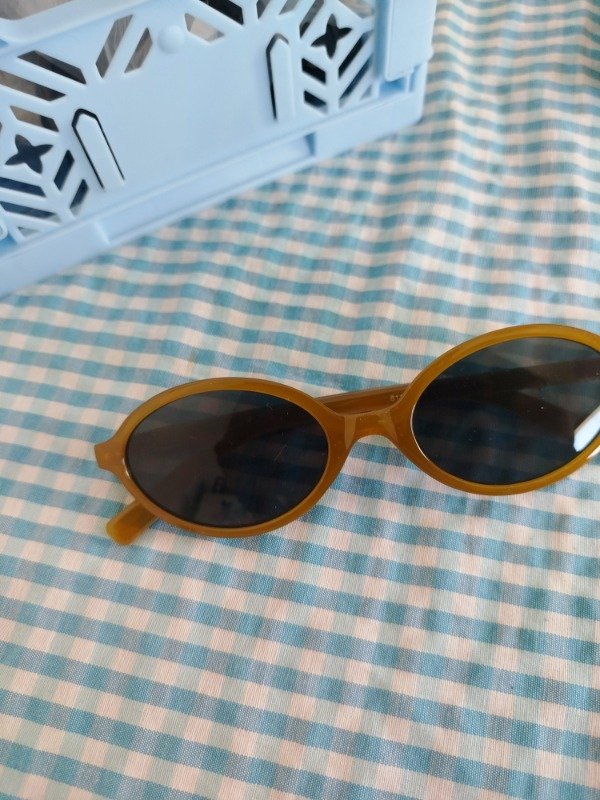 Anteojos de armazón de acetato naranja y cristales negros. Detalle decorativo en las patillas
