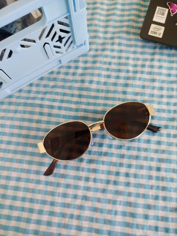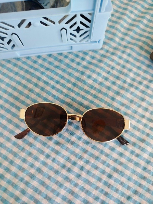 Anteojos premium de armazón metálico dorado y cristales marrones, sin graduacion y bisagras de metal.