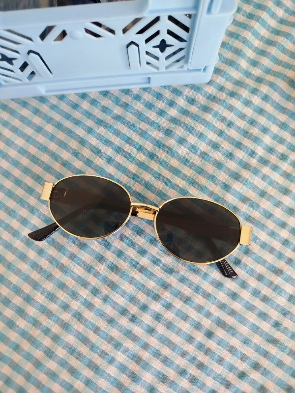 Anteojos premium de armazón metálico dorado y cristales negros, sin graduacion y bisagras de metal.
