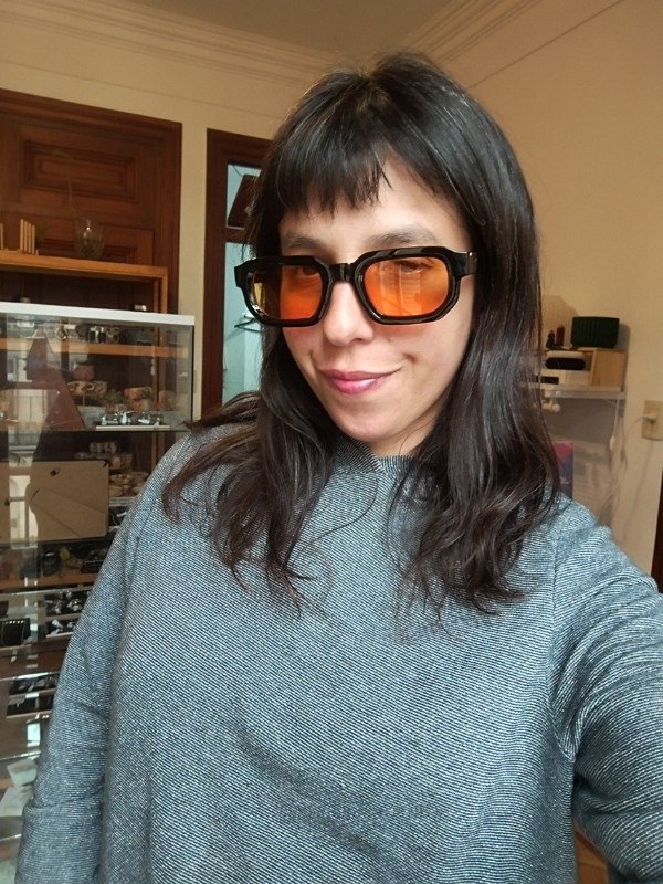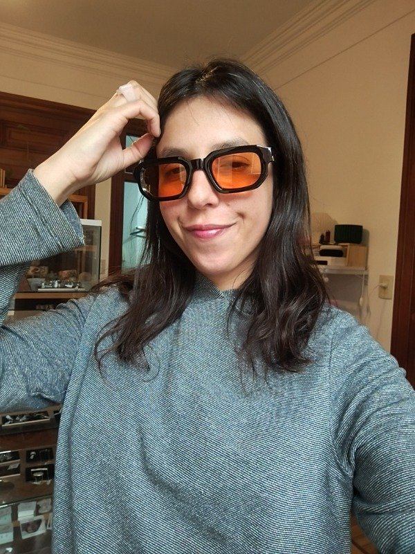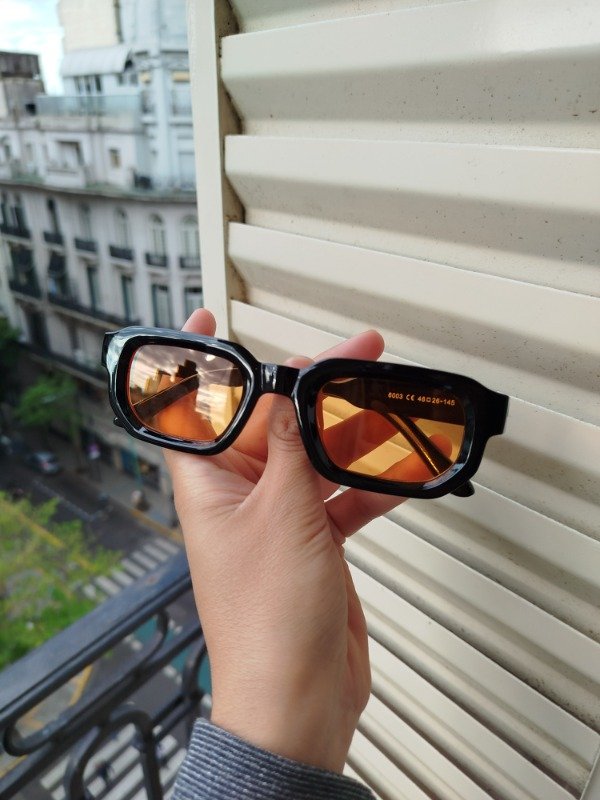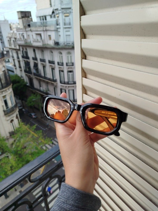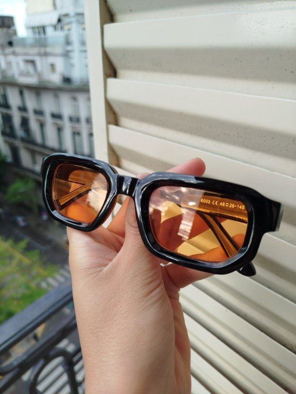 Anteojos de acetato negro y cristales naranja traslucido, sin graduacion.