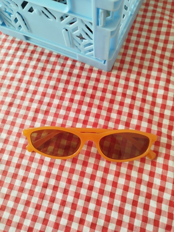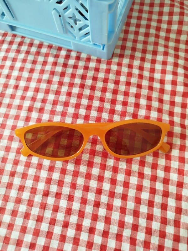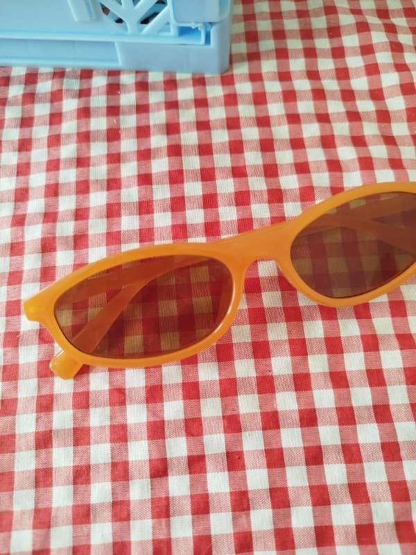 Anteojos de armazón naranja y cristales marrones, sin graduacion.