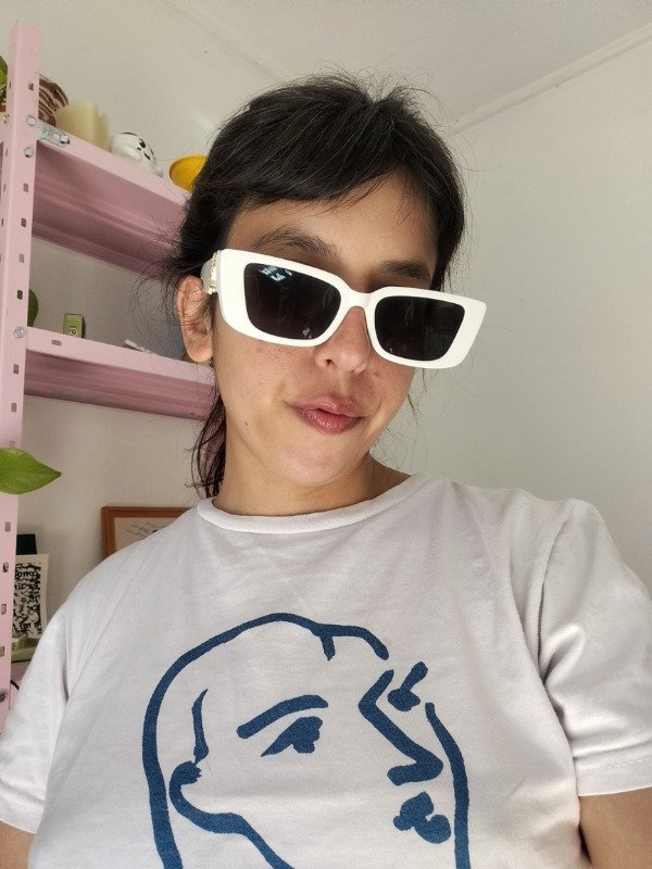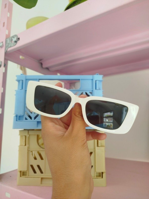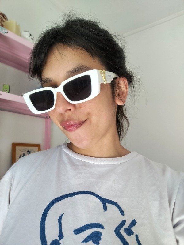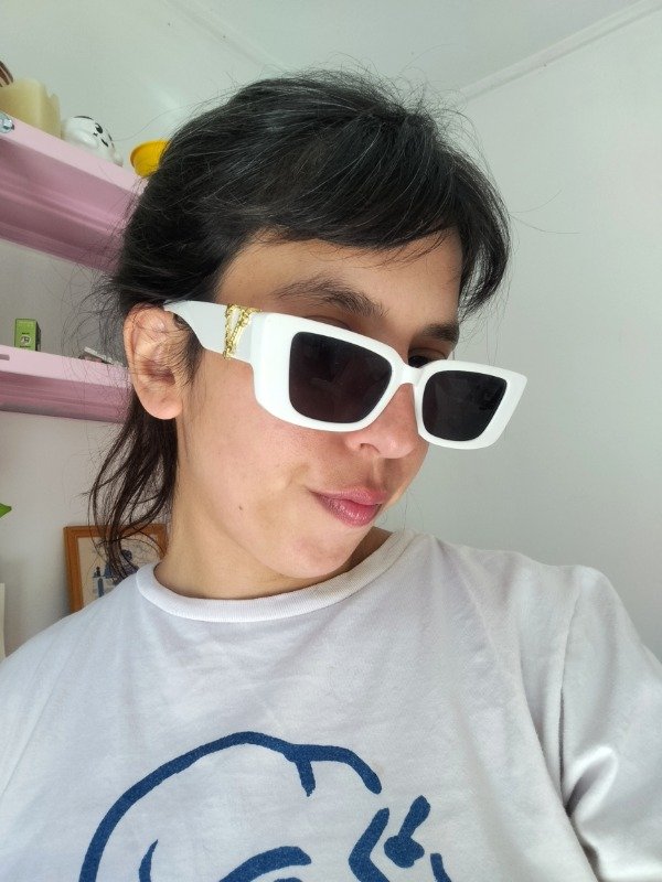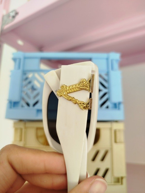 Anteojos de armazón de acetato blanco y cristales negros, sin graduacion. Detalle dorado en las patillas.